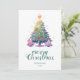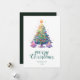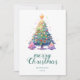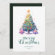 Colourful Christmas Tree Greeting Holiday Card with bright colours featuring a brightly decorated Christmas tree . Personalise the card with your custom greeting, family name, and year for a personal touch. The back of the card showcases your heartfelt message in white text set against a deep green background.