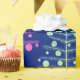 A festive holiday wrapping paper featuring multi coloured Christmas trees laden with ornaments on a solid dark blue background.
