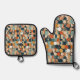 Circles and ovals in blue, teal, gold, black, rust, and brown combine to make an unusual and beautiful pot holder and oven mitt set. Modern, artistic, and stylish.
