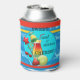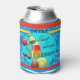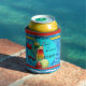 Can cooler featuring a colourful design with a cocktail and fruits on a striped background with pool image.
