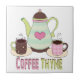 Colourful fun graphics of a coffee pot and two coffee cups. Graphic text at the bottom reads, COFFEE THYME. Great framed for your kitchen as a trivet.