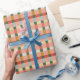 Winter holiday motifs in a colourful vintage colour palette, decorate these gift wrap sheets. Featuring a fun bold colour block pattern.