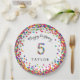 Custom printed plates: a cute idea for child's fifth birthday party! Featuring child's name and a "5" in confetti, with fun colourful rainbow confetti circles sprinkled all around the edge of the plate.