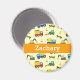 A cute and colourful construction vehicles theme pattern magnet for the boys. The pattern is make up of lots of construction elements like a red and yellow dump truck carrying the debris, an orange excavator, a green front loader pushing dirt, a blue and yellow concrete mixer, orange and white cones and a yellow and black construction zone barrier. Personalise child's name within space available. Perfect for boys who love construction vehicles, toys and machines!