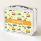 A cute and colourful construction vehicles theme pattern lunch box for the boys to pack their meals and even keep their small toys! The pattern is make up of lots of construction elements like a red and yellow dump truck carrying the debris, an orange excavator, a green front loader pushing dirt, a blue and yellow concrete mixer, orange and white cones and a yellow and black construction zone barrier. Because of the pattern, it looks like a tool box. Personalise child's name within space available. Perfect for boys who love construction vehicles, toys and machines!