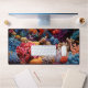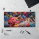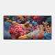 This is a desk mat featuring a colourful undersea coral reef. This product is great for individuals who like sea-themed merchandise and products featuring colourful designs. This product's image is appropriate for individuals of all ages and may be adjusted by the customer.