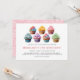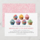 Sweet birthday party invitations with bright, colourful cupcakes lining the top of the card. Can be changed to any age. The reverse side is a light pink with a fun pattern.