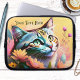 Laptop sleeve featuring a colourful painting of a cute kitty with flowers. The text is optional.