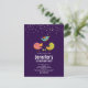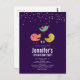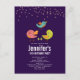 Postcard birthday invitation with a trio of cute and whimsical hand-drawn birds. 2 of the birds are standing together with some tiny green pine trees in between their feet. Another blue bird is flying up in the air between them. Set on a purple background. Faux rose-gold confetti image across the top.