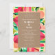 Modern wedding theme featuring cardstock inspired rectangle over pink, green, yellow, multicolored cutout inspired abstract design with white text.