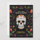 Against the black canvas, this invitation radiates warmth and joy, beckoning you to partake in an unforgettable occasion. At the centre, a whimsical sugar skull graces the design, while a delightful frame of doodle-style flowers envelops it, infusing the invitation with the spirit of remembrance and festivity.
