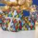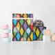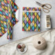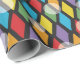 This wrapping paper has a stained glass-like vibe with diamonds of yellow, red, orange, blue, green, and purple with transparrent dots scattered across is all. Any gift would look bright and cheerfully given in this wrapping paper design.