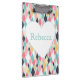 These colourful diamond shaped background graphics feature bright shades of pink, yellow, blue and white with a white heart outlined in light blue. In the middle of the heart you can customise your name. Place your order today!
