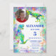 Colourful T-Rex dinosaur 5th birthday party invitation with photo template for the boy or girl who loves dinosaurs. A T-Rex roar to invite Dino fans to a fifth birthday party for dinosaur lovers. Personalise this colourful psychedelic Tyrannosaurus invitation with a photo of the birthday boy or girl, the number of the birthday and the party details and you are all set for a fun packed dinosaur themed dino birthday. All dinosaur species are welcome. Prehistoric jurassic era Dinosaur illustrations, original artwork by artist by Catherine Sweetman