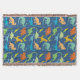 Dinosaur silhouette pattern. Tyrannosaurus Rex, titanosaurs, Triceratop, raptors, Ankylosaurs, Dino-Birds, Stegosaurus, Apatosaurus, Pteranodon and more in a colourful pattern in blue background, and dinosaurs in green, blue, yellow and orange.