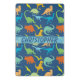 Colourful Dinosaur silhouette pattern that you can personalise and add your own name. Tyrannosaurus Rex, titanosaurs, Triceratop, raptors, Ankylosaurs, Dino-Birds, Stegosaurus, Apatosaurus, Pteranodon and more in a colourful pattern in blue background, and dinosaurs in green, blue, yellow and orange.