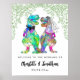 Welcome you guests with this fun colourful psychedelic dinosaur themed wedding welcome poster sign with funny dinosaur bride and groom with watercolor botanical greenery. If you and your partner love dinosaurs this is the perfect way to bring some roarsome dino love to your special day. Unique T-Rex and foliage watercolor illustrations in blue pink purple yellow orange and green hues. Easy to use templates with modern whimsical typography script. Original artwork by artist Catherine Sweetman