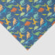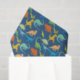 Colourful Dinosaur silhouette pattern. Tyrannosaurus Rex, titanosaurs, Triceratop, raptors, Ankylosaurs, Dino-Birds, Stegosaurus, Apatosaurus, Pteranodon and more in a colourful pattern in blue background, and dinosaurs in green, blue, yellow and orange.