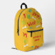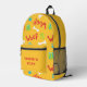 The design includes cute, colourful dog paw prints, white bones, and green tennis balls on a yellow background. The perfect backpack for your dog