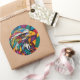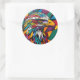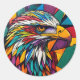 Vibrant and colourful eagle artwork. The eagle's head is depicted in a striking style with layers of bold, geometric shapes and bright colours, including reds, blues, greens, and yellows. The feathers are stylised with intricate detailing, showcasing a variety of shades that create a sense of depth and movement. The background consists of similarly colourful geometric patterns that enhance the overall dynamic composition. The eagle's piercing eye adds an intense focal point to the piece, conveying strength and majesty.