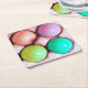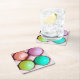 Four colourfully dyed Easter eggs in a carton highlight these spring theme paper coasters.