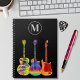Three cool guitar designs with Fire flame pattern Electric guitar, multicolored semi acoustic guitar and psychedelic classic acoustic guitar art illustration with personalised orange and black monogram. This easy to use template creates the perfect gift for a guitarist, musician and music lovers. Any guitar player will tell you that you can never have to many guitars. This cool modern musical instrument design celebrates the music energy of this wonderful musical instrument. Original artwork by artist Catherine Sweetman