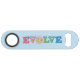 Colourful bottle opener sharing a message of peace. The design shows the word evolve with the letter O replaced with a round peace symbol. The letters are colourful and set against a blue background. Great way to promote peace and invite everyone to move away from conflict and create peace and harmony in the world and their surroundings.