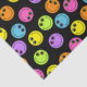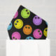 Orange, pink, purple, green, blue, and yellow faces on a black background cover this design.