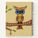This spiral notebook is tan with a colourful fantasy yellow owl with big blue eyes sitting on a tree branch with green leaves on the front and back.