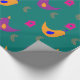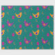 A colourful and whimsical wrapping paper pattern of yellow chickens with blue wings, pink chicken coops and purple chickens with yellow wings on a teal background with gold leaves, to give your gifts a rustic, country style.