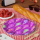 A paper plate with a cool multicolored pattern with abstract feathers and a purple pink background. A modern vibrant stylish design.