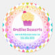 © 2021 Socialite Designs. Whimsical cupcake bakery sticker design incorporating a festive and colourful diamond pattern background, multi-colour scalloped border banner for your text, and cute cherry cupcake design.