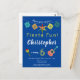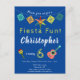This colourful birthday party invitation postcard features a string of colourful decorative cut paper with a pretty piñata hanging from the centre. Have some fiesta fun with this birthday party invite for a boy that has a maraca and a guitar. This card features bright colours with a dark blue background and colourful geometric designs on the back.