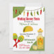 Fun south of the border Fiesta themed wedding shower invitation, with red, green and yellow graphics of chilli peppers, a taco, maracas and a tequila bottle. Personalise the custom text for your event.
