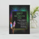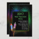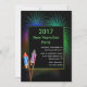Colourful New Years Eve party invitation done in black, with graphics of neon coloured fireworks, on the background. Graphics of two firework rockets decorate the bottom left side of the green edged black text area. Personalise all the text for your New Years party.