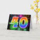 The front of this exciting, fun, and vibrant greeting card design features a colourful celebratory fireworks inspired pattern, along with the number "40" featuring a multicolored rainbow like gradient pattern, on a black coloured background. The inside features a personalised greeting message, or could perhaps be cleared and left blank if a message is to be written by hand instead. A greeting card like this might be a fun, happy way of sending a message to somebody who is celebrating their fortieth birthday, or perhaps to a couple celebrating their fortieth wedding anniversary, or to somebody celebrating some other 40th event. [~Z0000342]