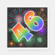 This exciting, fun, and vibrant paper napkin design features a colourful celebratory fireworks inspired pattern, along with the number "46" featuring a multicolored rainbow inspired gradient pattern, on a black coloured background. Paper napkins like these could be fun to use at a party being held to honour somebody’s forty sixth birthday, or perhaps a couple’s forty sixth wedding anniversary, or some other 46th event. [~Z0000340]
