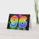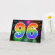 The front of this exciting, fun, and vibrant greeting card design features a colourful celebratory fireworks inspired pattern, along with the number "96" featuring a multicolored rainbow inspired gradient pattern, on a black coloured background. The inside features a custom greeting message, or could perhaps be cleared and left blank if a message is to be written by hand instead. A greeting card like this might be a fun way to acknowledge somebody’s ninety sixth birthday, or perhaps a couple’s ninety sixth wedding anniversary, or some other 96th event. [~Z0000342]