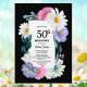 A vibrant black-bordered floral 50th birthday party invitation featuring pink and purple flowers, white daisies, and greenery surrounding the text.