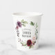 Custom paper cups to celebrate a milestone birthday, this feminine floral design features garden roses in bright watercolor hues of red, plum purple, and blush pink with lush greenery. The text template may be personalised with the guest of honour's name and age. Shown here as a 100th birthday, you can edit the age to any age.