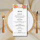 Bring the vibrant spirit of your special day to life with this personalised Mexican Wedding menu card, perfect for a Fiesta Wedding theme! Featuring bright pink, orange and yellow flowers paired with festive flag bunting against a crisp white background, this menu card radiates colourful fun and elegance. Pink and orange floral maracas interspersed with dusty blue accents add a playful yet refined touch. Designed with a blend of traditional Mexican-style and flowing script fonts, it’s the perfect way to celebrate love, culture, and joy at your wedding fiesta!