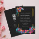 This wedding invitation features a vibrant Mexico fiesta floral theme with colourful blooms set against a sleek black background. The front showcases bold and lively floral accents complemented by elegant gold geometric details, blending festive charm with modern sophistication. The reverse side includes a QR code for RSVP, venue directions, and registry information, adding a practical and tech-savvy touch. Perfect for couples looking to celebrate their special day with a lively, stylish, and culturally inspired design.