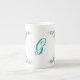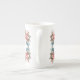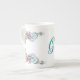 Elegant white bone china mug, with graphics of colourful floral arrangements and a single letter monogram, on the front. Matching tea pot is available.