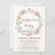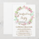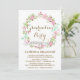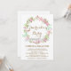 Whimsical and feminine invitation featuring floral wreath in pink, blush, green tea and mint green.