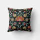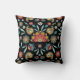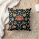 This attractive and distinctive throw pillow has a pattern of flowers and leaves in a unique eastern batik style. Colours used include gold, cranberry red, blue, and white. The pattern is placed on a dramatic black background. Both sides of the pillow have the same design.