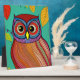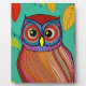 Cute red, blue, purple and brown owl and leaves folk art style AI art.