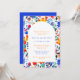 A colourful summer fiesta theme bridal shower invitation. This invitation features a white arch over a wide boarder of vibrant Mexican folk style flowers in blue, orange and pink. Personalise with your details. The reverse is in solid electric blue.