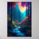 A colourful forest comes alive with vibrant hues, enchanting the senses with its natural beauty. In the midst of this picturesque setting, a charming azure stream rushes through the heart of the woodland, adding a touch of serenity and grace to this idyllic scene.