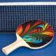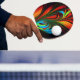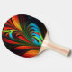 A flowery fractal design in many colours--red, green, and yellow--on a black background makes a splash on this ping pong paddle.