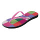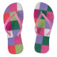 These fun and colourful patchwork flip flops have a retro appearance, the knitted patchwork image is taken from a photograph of an original hand knitted pattern. The patchwork squares blanket has been photographed to show it looking natural and "pre-loved" you may even see a few pet hairs! and there will be bobbly bits, stray threads and creases, this all makes up the natural look of a much loved piece of patchwork knitting on these flip flop sandels. The natural look of the image give the flip flops a quirky vintage appearance.